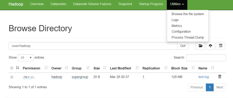 web 화면 상단의 Utilities > Browse the file system 에서 /user/hadoop 디렉토리로 이동하면, 테스트한 test,log 파일을 확인 할 수 있다.