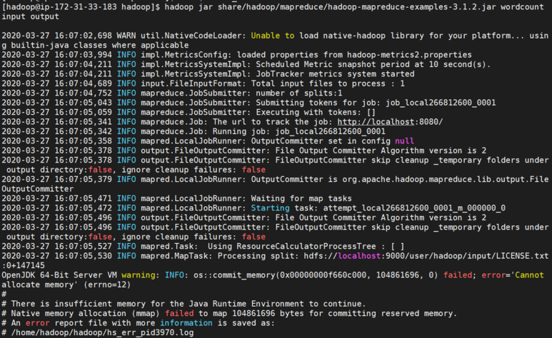 [hadoop@ip-172-31-33-183 hadoop]$ hadoop jar share/hadoop/mapreduce/hadoop-mapreduce-examples-3.1.2.jar wordcount input output 2020-03-27 16:39:39,705 WARN util.NativeCodeLoader: Unable to load native-hadoop library for your platform... using builtin-java classes where applicable 2020-03-27 16:39:41,118 INFO impl.MetricsConfig: loaded properties from hadoop-metrics2.properties 2020-03-27 16:39:41,281 INFO impl.MetricsSystemImpl: Scheduled Metric snapshot period at 10 second(s). 2020-03-27 16:39:41,281 INFO impl.MetricsSystemImpl: JobTracker metrics system started java.net.ConnectException: Call From ip-172-31-33-183.ap-northeast-2.compute.internal/172.31 .33.183 to localhost:9000 failed on connection exception: java.net.ConnectException: Connection refused; For more details see: http://wiki.apache.org/hadoop/ConnectionRefused at sun.reflect.NativeConstructorAccessorImpl.newInstance0(Native Method) at sun.reflect.NativeConstructorAccessorImpl.newInstance(NativeConstructorAccessorImpl.java:62) at sun.reflect.DelegatingConstructorAccessorImpl.newInstance(DelegatingConstructorAccessorImpl.java:45) at java.lang.reflect.Constructor.newInstance(Constructor.java:423) at org.apache.hadoop.net.NetUtils.wrapWithMessage(NetUtils.java:831) at org.apache.hadoop.net.NetUtils.wrapException(NetUtils.java:755) at org.apache.hadoop.ipc.Client.getRpcResponse(Client.java:1515) |