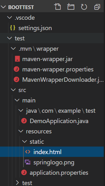 실행은 java/com/example/test 패키지내의 DemoApplication.java 파일을 실행하면 됩니다. (Ctrl + F5)