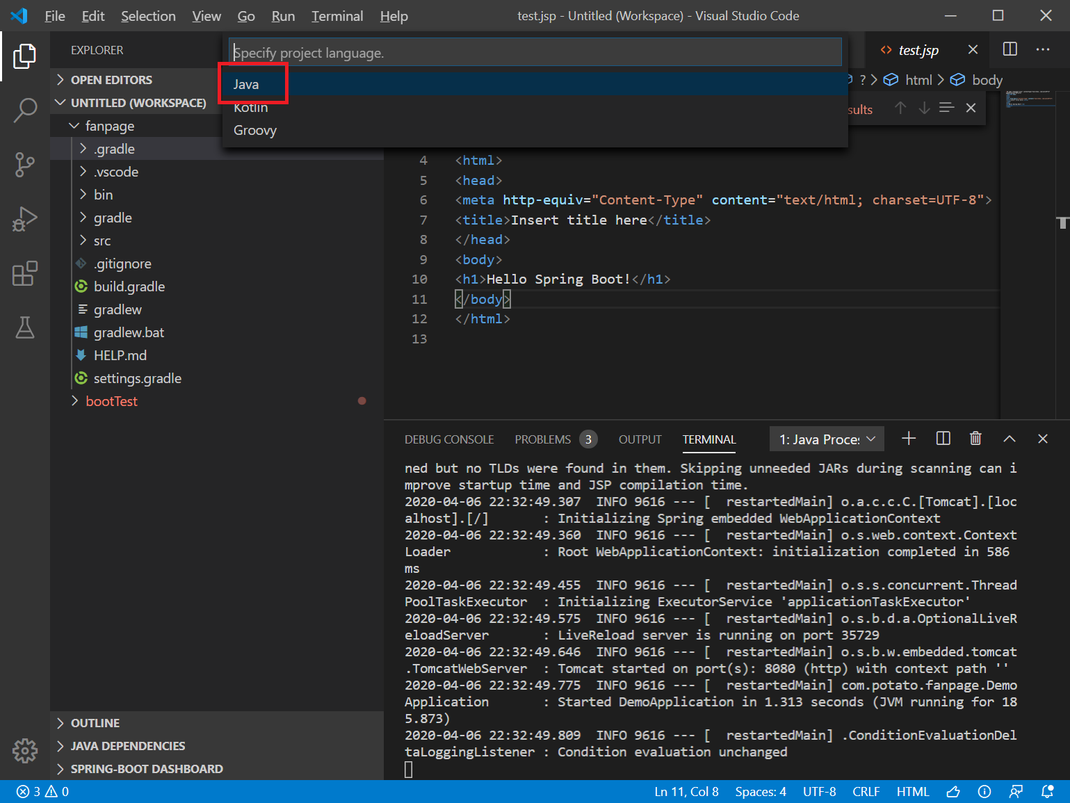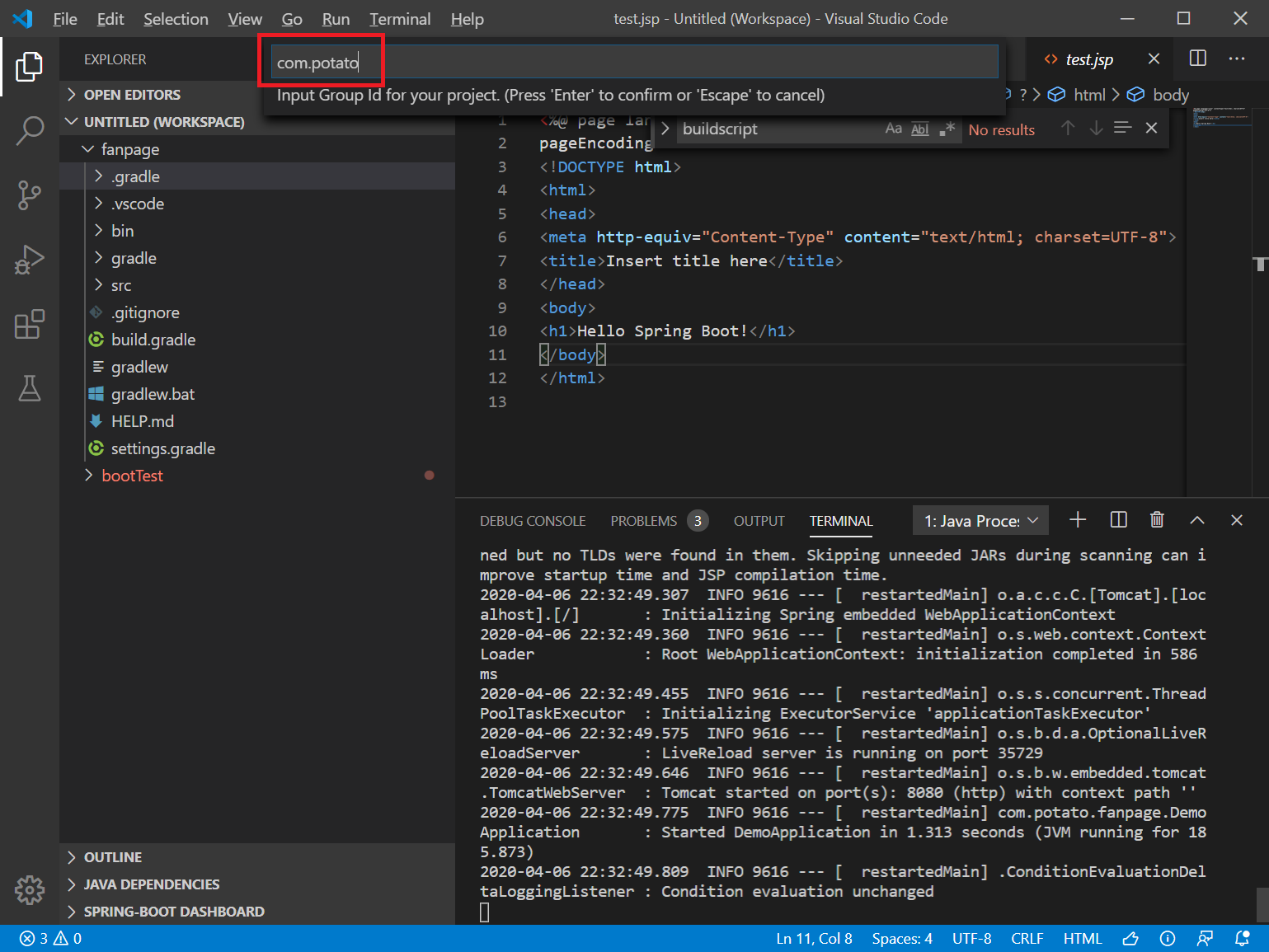 이렇게 VSCODE에서 Spring boot gradle을 이용한 프로젝트 생성을 완료했습니다.
