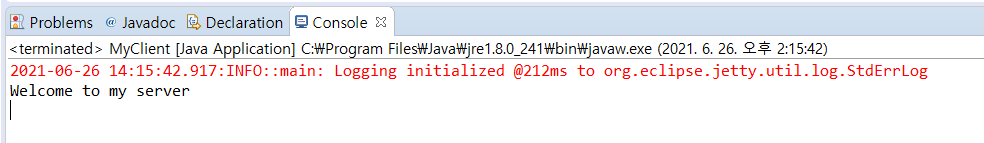 4. MyClient로그에 MyServer에서 write한 Content가 출력되는 것을 확인할 수 있다.